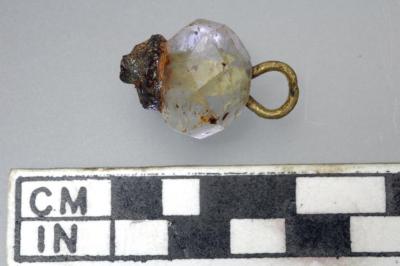 Four faceted crystal button. Fitting has rusted concretion at base that discolors crystal bead. One of 6 crystal buttons. See also 1986.008.0108a, b, d--f. Dimensions