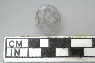 Four faceted crystal button. No fitting. Chipped where fitting was attached. Many cracks and fissures. One of 6 crystal buttons. See also 1986.008.0108a--f. Dimensions