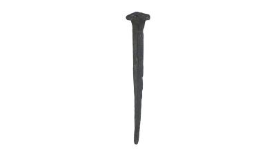 A 22-centimeter-long spike comes from the 1622 galleon Nuestra Señora de Atocha. The hand forged, wrought-iron fastener is of the typical style from the 1622 ships – a square shank that tapers to a point, with a “rose head” formed by flattening the larger end. Thousands of spikes and other fasteners would have been required to construct a galleon.Dimensions