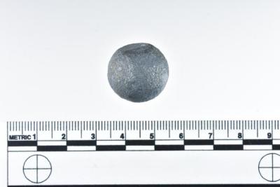 2.0 x 1.8 cm. 45.96 grams. Flattened on one side. One of nineteen round shot. See also 1986.008.2226a--o, q--s.