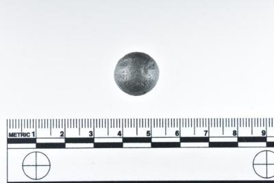 1.5 cm. diameter. 19.65 grams. One of nineteen round shot. See also 1986.008.2226a--p, r, s.