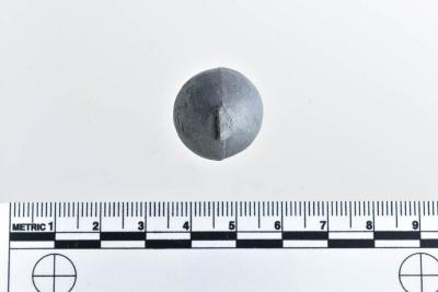 2.1 x 2.0 x 1.9 cm. 46.62 grams. One of eighteen round shot. See also 1986.008.2231a--e, g--r.Exhibition Label