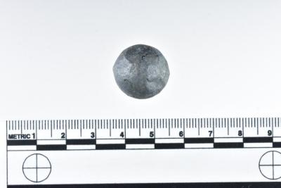 1.8 cm. diameter. 33.49 grams. One of ten musket shot (1986.008.2952a--j). Originally from a batch of various musket and arquebus shot accessioned under two numbers: 1986.008.2026 and 1986.008.2027.