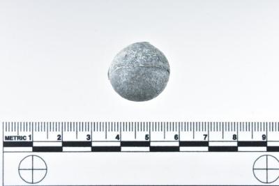 2.0 x 1.9 cm. 44.59 grams. One of ten musket shot (1986.008.2953a--j). Originally from a batch of various musket and arquebus shot accessioned under two numbers: 1986.008.2026 and 1986.008.2027.