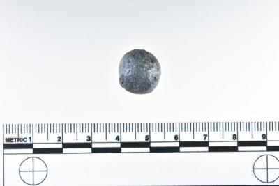 1.5 x 1.4 cm. 18.43 grams. One of ten arquebus shot (1986.008.2969a--j). Originally from a batch of various musket and arquebus shot accessioned under two numbers: 1986.008.2026 and 1986.008.2027.
