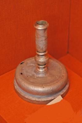Molded domed-circular form. Line-incised around the sides, central inset threaded fitting.