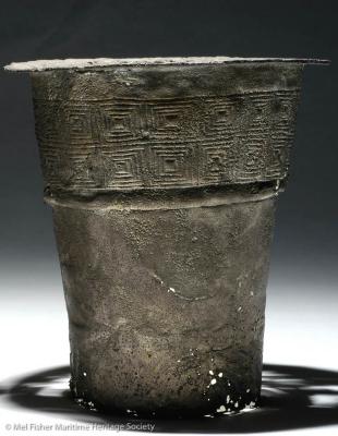 Tapering cylindrical form, everted rim, decorated around the sides with two bands of multiple conjoined square Chimu-Inca style frets. Absent one half around the sides. One of two nested beakers. See also 1987.013.0002a.Dimensions