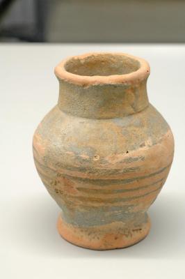A small earthenware jar comes from the wreck of the merchant patache Buen Jesus, sunk in the deep water between Florida and Cuba in 1622. The stout jar is made of a fine reddish paste that is covered inside and out with grayish tin enameling, much of which has been abraded. The exterior is encircled with ridges at the widest part of the body. The jar stands 14.0 centimeters tall, and it is 11.0 centimeters at its widest diameter.Dimensions