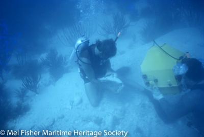 Underwater photo of an unidentified diver (holding a stack of encrusted pewter basins) while being filmed by J. Barry Herron at Henrietta Marie shipwreck site.