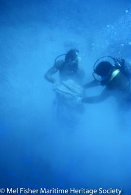 Underwater photo of an unidentified diver and Captain Demostines "Mo" Molinar (right) holding a stack of encrusted pewter basins while being filmed by J. Barry Herron (out of frame) at Henrietta Marie shipwreck site.
