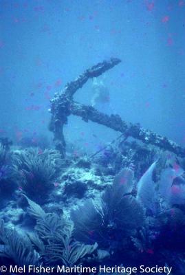 Underwater photo of an encrusted anchor on New Ground Reef near the Henrietta Marie shipwreck site.
