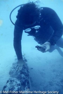 Underwater photo of archaeologist R. Duncan Mathewson III investigating hair pitch sample from the Henrietta Marie timbers at the shipwreck site.