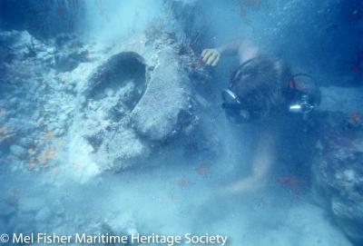 Underwater photo of a diver investigating the copper cauldron at the Henrietta Marie shipwreck site.