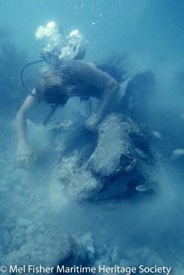 Underwater photo of a diver investigating the copper cauldron at the Henrietta Marie shipwreck site.