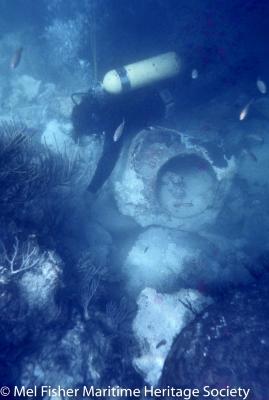 Underwater photo of a diver tying off a line to the copper cauldron at the Henrietta Marie shipwreck site.