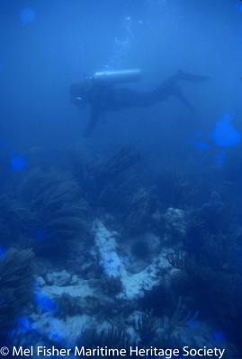 Underwater photo of a diver investigating an encrusted anchor at the Henrietta Marie shipwreck site.