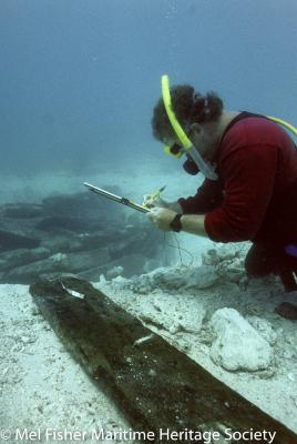 An underwater photo of archaeologist David Moore documenting loose timber next to the