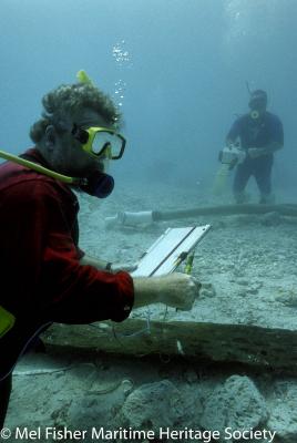 An underwater photo of archaeologist David Moore documenting loose timber next to the Henrietta Marie shipwreck. Brian Blanco is in the background with an underwater video camera.