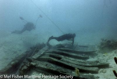 An underwater photo of Mel Fisher Maritime Heritage Society archaeologist Corey Malcom returning loose hull structure pieces from the Henrietta Marie shipwreck to the rest of the structure. National Geographic photographer Courtney Platt is in the background.
