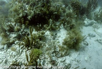 An underwater photo of the undisturbed sea bottom at the Henrietta Marie shipwreck site.