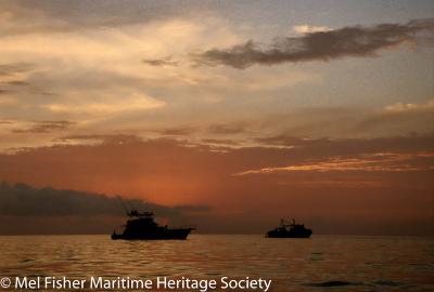 Sunset with R/V Robo (left) and R/V Lakota anchored at the Henrietta Marie shipwreck site.