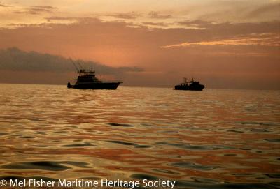 Sunset with R/V Robo (left) and R/V Lakota anchored at the