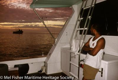 National Association of Black Scuba Divers' Michael Cottman enjoying the sunset with R/V Lakota at the Henrietta Marie shipwreck site.