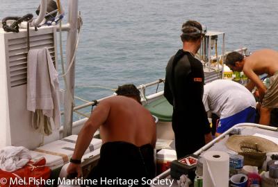 Left to right: RPM Nautical Foundation captain/diver Cristian Swanson, Mel Fisher Maritime Heritage Society archaeologist Corey Malcom, MFMHS archaeological assistant Brian Blanco, and RPM Nautical Foundation captain Bruce Darby preparing dive equipment on the back deck of the R/V Lakota at the Henrietta Marie shipwreck site.