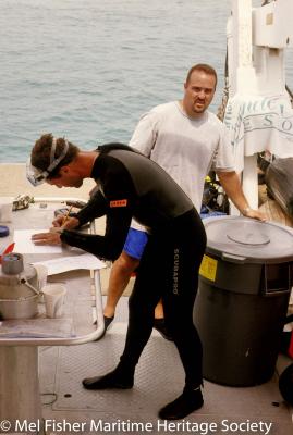 Mel Fisher Maritime Heritage Society archaeologist Corey Malcom and MFMHS archaeological assistant Brian Blanco discussing excavation of the Henrietta Marie hull structure.