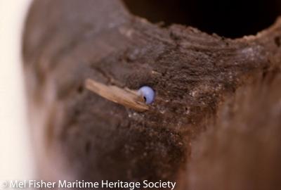 Close-up of blue glass bead embedded in wood parrel truck (HM2001-9) recovered from the Henrietta Marie shipwreck. Photographed on the R/V Lakota during excavation.