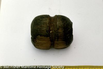 Wood parrel truck (HM2001-9) recovered from the Henrietta Marie shipwreck. Photographed on the R/V Lakota during excavation.