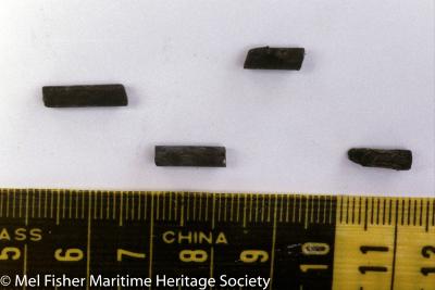 4 tubular glass trade beads (HM2001-3) recovered from the Henrietta Marie shipwreck. Photographed on the R/V Lakota during excavation.
