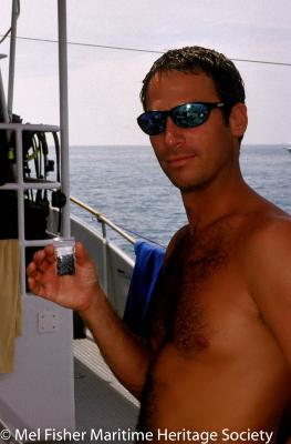 RPM Nautical Foundation captain Bruce Darby holding a bag of glass trade beads recovered from the