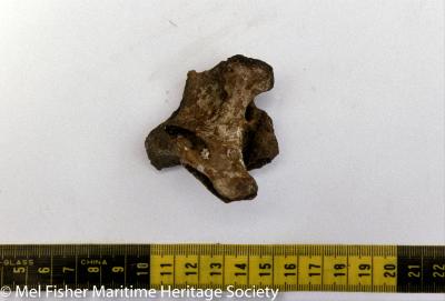 Bone (HM2001-6) recovered from the Henrietta Marie shipwreck. Photographed on the R/V Lakota during excavation.