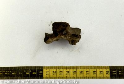 Bone (HM2001-6) recovered from the Henrietta Marie shipwreck. Photographed on the R/V Lakota during excavation.