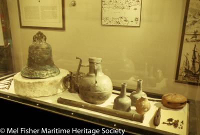 Photo of Henrietta Marie shipwreck items on display in the Mel Fisher Maritime Heritage Society exhibit fall 1988.