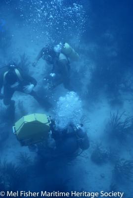 Underwater photo of an unidentified diver and Captain Demostines "Mo" Molinar (left) being filmed by J. Barry Herron at Henrietta Marie shipwreck site.