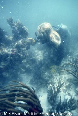 Underwater photo of a diver investigating a coral head near the Henrietta Marie shipwreck site.