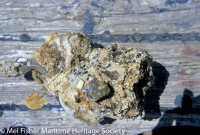 Photo of artifacts from one days work. Close-up of an unidentified Henrietta Marie shipwreck artifact (with glass beads encrusted to it) on the deck of the Treasure Salvors Inc. replica galleon.
