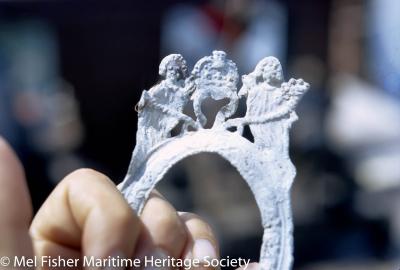 Photo of artifacts from one days work. Close up of lead mirror frame recovered from The Henrietta Marie shipwreck on the deck of Treasure Salvors Inc. replica galleon.