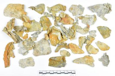 Small piece of sheathing. Fragmented, partly encrusted