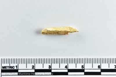 2.3 x 0.4 x 0.4 cm. 0.38 grams. Left tibia fragment. Recovered in 1984. One of four pieces. See also 1986.008.2605a, b, d. Information provided by bone expert from the University of Miami (Florida) Monica Faraldo.