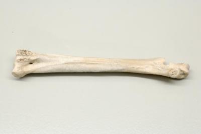 8.2 x 1.3 x 1.0 cm. 2.81 grams. Right tarso metatarsus. Recovered in 1986. Information provided by bone expert from the University of Miami (Florida) Monica Faraldo.Exhibition Label