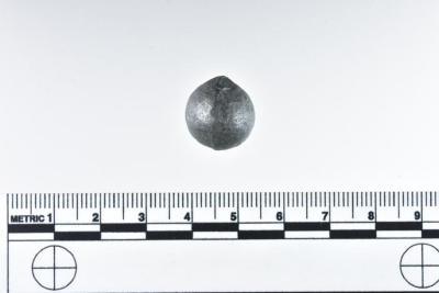 1.5 x 1.4 cm. 19.56 grams. One of ten arquebus shot (1986.008.2970a--j). Originally from a batch of various musket and arquebus shot accessioned under two numbers: 1986.008.2026 and 1986.008.2027.