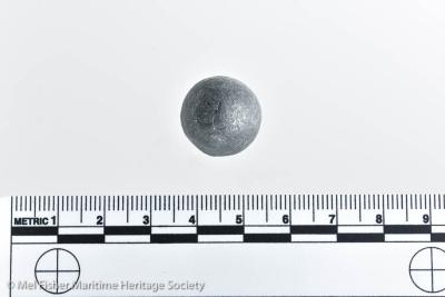 1.7 cm. diameter. 31.85 grams. Musket shot. One of ten shot (7 arquebus, 3 musket 1986.008.3015a--j). Originally from a batch of various musket and arquebus shot accessioned under two numbers: 1986.008.2026 and 1986.008.2027.