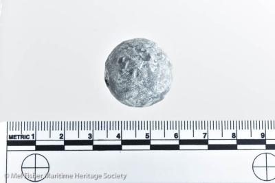 2.4 cm. diameter. 78.10 grams. One of ten musket shot (1986.008.3016a--j). Originally from a batch of various musket and arquebus shot accessioned under two numbers: 1986.008.2026 and 1986.008.2027.