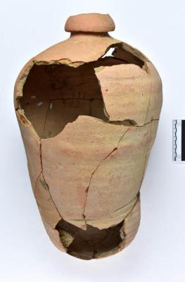 19 cross-mended pieces from an earthenware olive jar, representing approximately 70% of the original vessel.