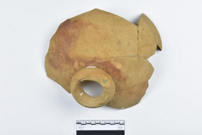 Neck and body section consisting of 5 cross-mended pieces from an earthenware olive jar.