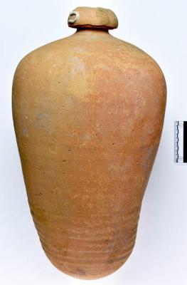 An olive jar from the wreck of the 1622 ship Buen Jesus. Buen Jesus was a 120-ton “patache” swamped in the deep waters of the Florida Straits in the same hurricane that claimed the galleons Atocha and Santa Margarita. The site was partially excavated by Seahawk Deep Ocean Technology in 1990-91, and a portion of the Buen Jesus artifact assemblage is now in the MFMM collection. The bulbous earthenware amphora, likely used to carry wine, is 56 cm tall x 30 cm wide.Dimensions