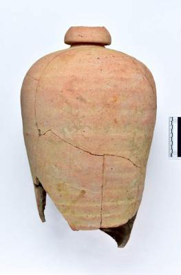 A body section of an earthenware olive jar, representing approximately 70% of the original vessel. Many pieces cross-mended. The bottom section is missing.